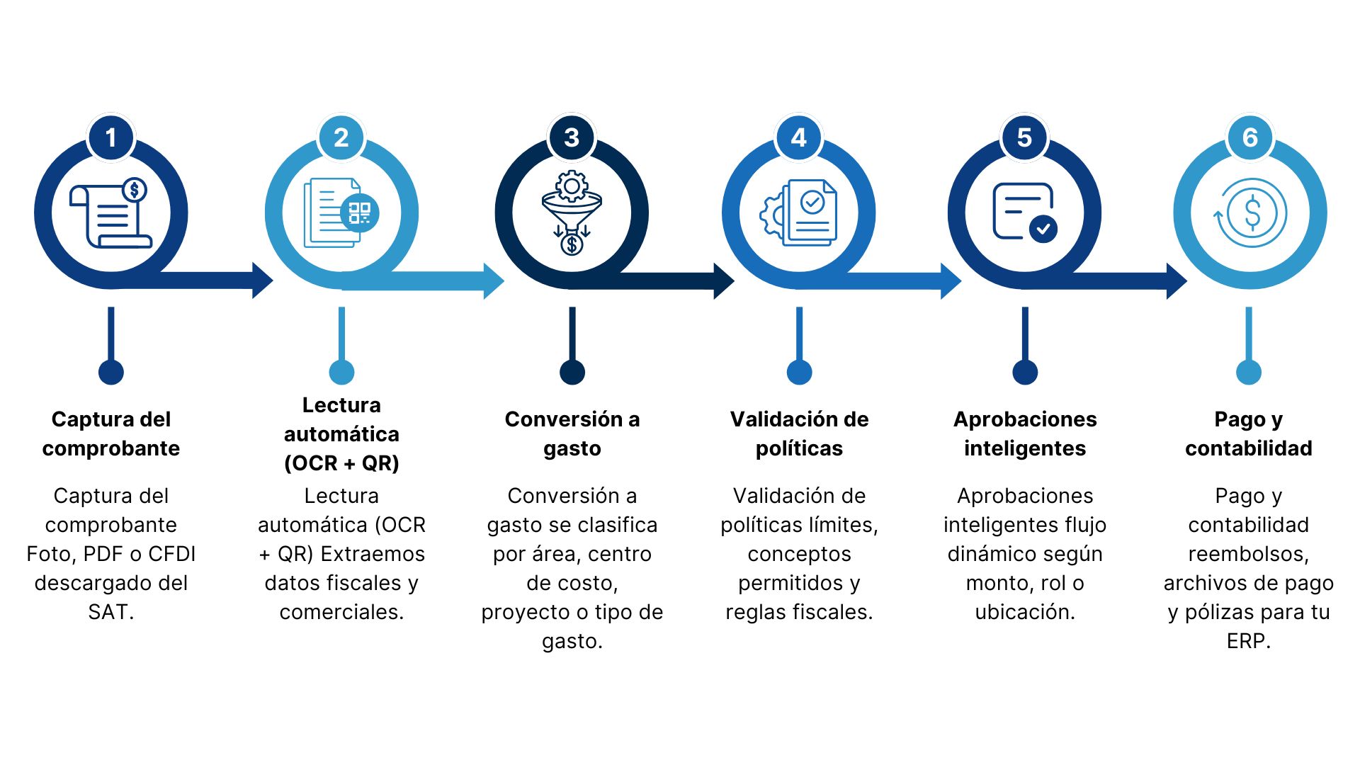 Venturis centraliza todo el ciclo del gasto: captura, validación, aprobación, pago y registro contable. Cada área trabaja más rápido, Finanzas tiene visibilidad completa y la empresa opera con control real.