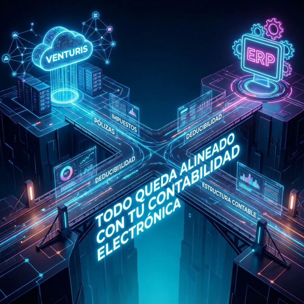 Venturis envía pólizas, impuestos, deducibilidad y estructura contable directamente a tu ERP. Todo queda alineado con tu contabilidad electrónica.